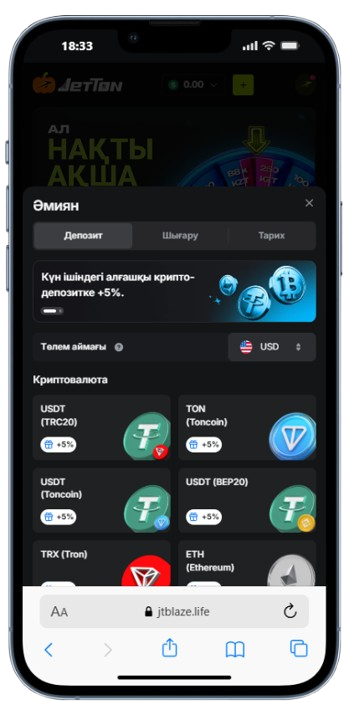 Криптовалюталарды таңдағандар үшін Jetton бірнеше ыңғайлы шотты толтыру әдістерін ұсынады. Ең танымал нұсқа – Jetton монетасы арқылы шотты толтыру, бұл ойыншыларға депозитті минималды шығындармен және кідіріссіз енгізуге мүмкіндік береді. Бұл әдіс криптовалюталарды белсенді пайдаланушылар үшін өте қолайлы, себебі ол қаражат аударуды жылдам әрі қауіпсіз жүзеге асыруға мүмкіндік береді.